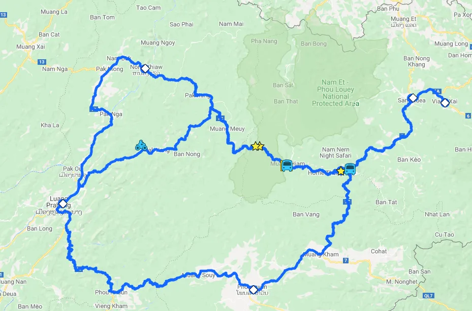 PRIVATE CAR/MOTORCYCLE: From Luang Prabang go north on Road #13 about 100 km and turn right onto Road #1C at the Pak Mong junction (follow the sign towards Nong Kiau). Travel 200 km on Road #1C northeast past Muang Hiam. The drive is about 9-10 hours.